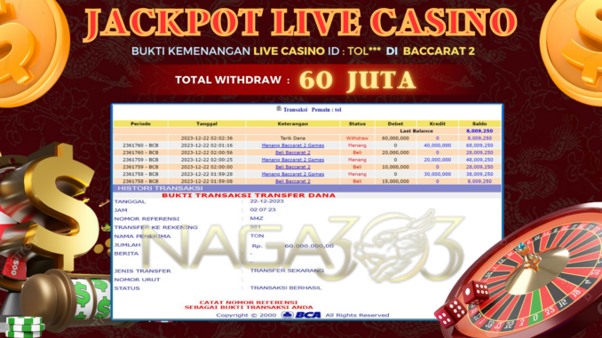 MEMBER NAGA303 MENERIMA PELUNASAN KEMENANGAN JACKPOT LIVE CASINO di BACCARAT 2 Rp 60.000.000,- LUNAS