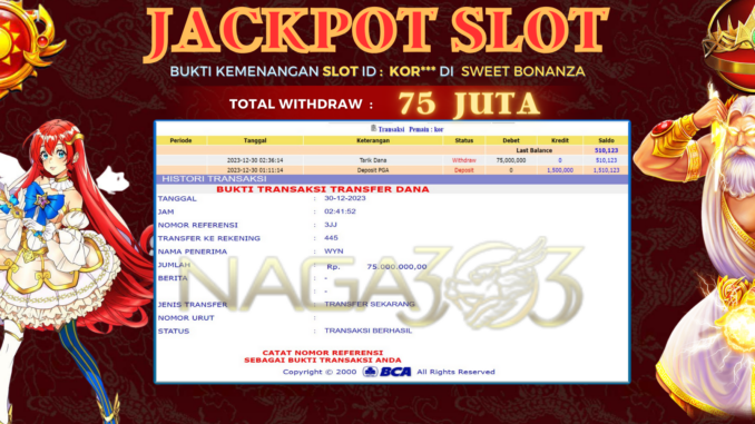 NAGA303 mengucapkan selamat kepada user id : KOR** yang telah berhasil mendapatkan jackpot pada permainan SLOT DI SWEET BONANZA. Kemenangan sebesar Rp 75.000.000,-. telah dibayarkan LUNAS oleh pihak naga303 kepada pemilik user id setelah yang bersangkutan mengisi formulir withdraw. Proses pencairan dana berlangsung sangat cepat hanya dalam waktu 6-11 menit sudah berada dalam rekening pemilik user id. Bukti transfer yang dapat anda lihat adalah bukti SAH / VALID yang langsung di dapatkan melalui bukti transaksi dari Bank yang digunakan untuk pengiriman dana pada rekening pemilik user id. Terima kasih kami sampaikan kepada para pengguna setia naga303 yang telah menggunakan situs kami, sebagai Bandar Terpercaya yang pastinya membayar semua kemenangan member hingga lunas. Apakah Naga303 PENIPU ? Reputasi “NAGA303 TERPERCAYA” sudah sangat melekat. puluhan hingga ratusan ribu pengguna setia NAGA303 tetap menggunakan situs terbesar dan terbaik di Indonesia ini. Hapus rasa was-was dan khawatir anda, kemenangan anda berapapun PASTI dibayarkan hingga lunas.