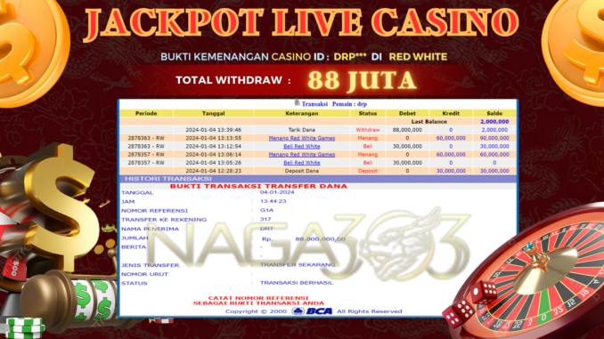 NAGA303 JACKPOT LIVE CASINO DI RED WHITE Rp 88.000.000,- LUNAS