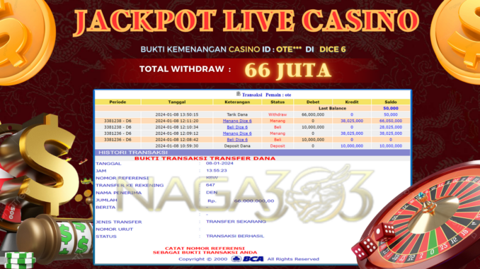 NAGA303 JACKPOT LIVE CASINO di DICE 6 Rp 66.000.000,- LUNAS