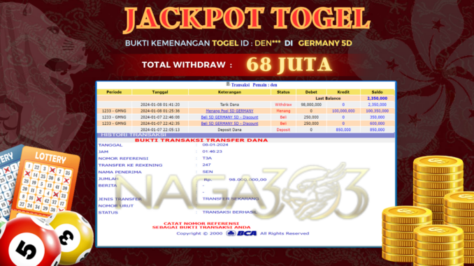 MEMBER NAGA303 MENERIMA PELUNASAN KEMENANGAN JACKPOT TOGEL DI GERMANY 5D Rp 68.000.000,- LUNAS