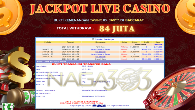 NAGA303 mengucapkan selamat kepada user id : JAS** yang telah berhasil mendapatkan jackpot pada permainan LIVE CASINO di BACCARAT. Kemenangan sebesar Rp 84.000.000,-. telah dibayarkan LUNAS oleh pihak naga303 kepada pemilik user id setelah yang bersangkutan mengisi formulir withdraw. Proses pencairan dana berlangsung sangat cepat hanya dalam waktu 6-11 menit sudah berada dalam rekening pemilik user id. Bukti transfer yang dapat anda lihat adalah bukti SAH / VALID yang langsung di dapatkan melalui bukti transaksi dari Bank yang digunakan untuk pengiriman dana pada rekening pemilik user id. Terima kasih kami sampaikan kepada para pengguna setia naga303 yang telah menggunakan situs kami, sebagai Bandar Terpercaya yang pastinya membayar semua kemenangan member hingga lunas. Apakah Naga303 PENIPU ? Reputasi “NAGA303 TERPERCAYA” sudah sangat melekat. puluhan hingga ratusan ribu pengguna setia NAGA303 tetap menggunakan situs terbesar dan terbaik di Indonesia ini. Hapus rasa was-was dan khawatir anda, kemenangan anda berapapun PASTI dibayarkan hingga lunas.