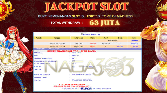 MEMBER NAGA303 MENERIMA PELUNASAN KEMENANGAN JACKPOT SLOT DI TOME OF MADNESS Rp 63.000.000,- LUNAS
