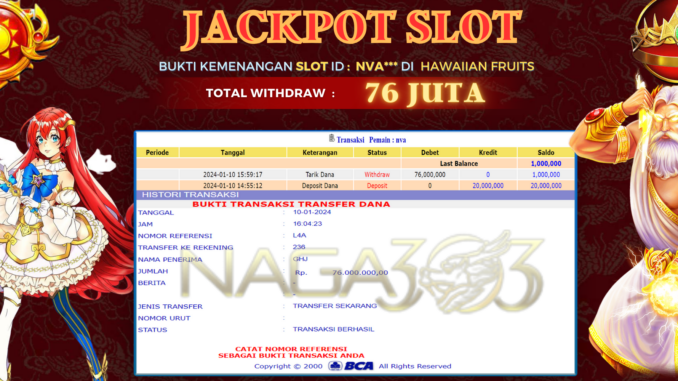 NAGA303 mengucapkan selamat kepada user id : NVA** yang telah berhasil mendapatkan jackpot pada permainan SLOT DI HAWAIIAN FRUITS. Kemenangan sebesar Rp 76.000.000,-. telah dibayarkan LUNAS oleh pihak naga303 kepada pemilik user id setelah yang bersangkutan mengisi formulir withdraw. Proses pencairan dana berlangsung sangat cepat hanya dalam waktu 6-11 menit sudah berada dalam rekening pemilik user id. Bukti transfer yang dapat anda lihat adalah bukti SAH / VALID yang langsung di dapatkan melalui bukti transaksi dari Bank yang digunakan untuk pengiriman dana pada rekening pemilik user id. Terima kasih kami sampaikan kepada para pengguna setia naga303 yang telah menggunakan situs kami, sebagai Bandar Terpercaya yang pastinya membayar semua kemenangan member hingga lunas. Apakah Naga303 PENIPU ? Reputasi “NAGA303 TERPERCAYA” sudah sangat melekat. puluhan hingga ratusan ribu pengguna setia NAGA303 tetap menggunakan situs terbesar dan terbaik di Indonesia ini. Hapus rasa was-was dan khawatir anda, kemenangan anda berapapun PASTI dibayarkan hingga lunas.