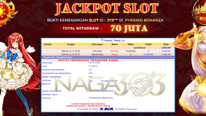 NAGA303 mengucapkan selamat kepada user id : JYS*** yang telah berhasil mendapatkan jackpot pada permainan SLOT DI PYRAMID BONANZA. Kemenangan sebesar Rp 70.000.000,-. telah dibayarkan LUNAS oleh pihak naga303 kepada pemilik user id setelah yang bersangkutan mengisi formulir withdraw. Proses pencairan dana berlangsung sangat cepat hanya dalam waktu 6-11 menit sudah berada dalam rekening pemilik user id. Bukti transfer yang dapat anda lihat adalah bukti SAH / VALID yang langsung di dapatkan melalui bukti transaksi dari Bank yang digunakan untuk pengiriman dana pada rekening pemilik user id. Terima kasih kami sampaikan kepada para pengguna setia naga303 yang telah menggunakan situs kami, sebagai Bandar Terpercaya yang pastinya membayar semua kemenangan member hingga lunas. Apakah Naga303 PENIPU ? Reputasi “NAGA303 TERPERCAYA” sudah sangat melekat. puluhan hingga ratusan ribu pengguna setia NAGA303 tetap menggunakan situs terbesar dan terbaik di Indonesia ini. Hapus rasa was-was dan khawatir anda, kemenangan anda berapapun PASTI dibayarkan hingga lunas.