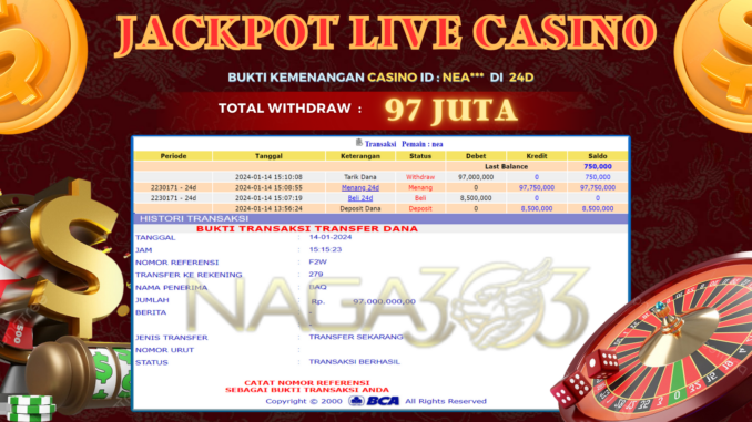NAGA303 JACKPOT LIVE CASINO di 24D Rp 97.000.000,- LUNAS