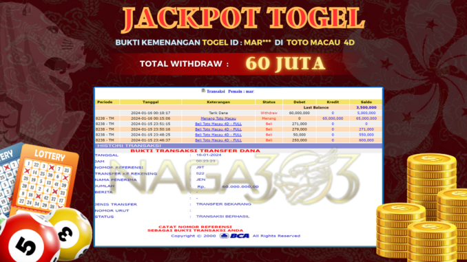 MEMBER NAGA303 MENERIMA PELUNASAN KEMENANGAN JACKPOT TOGEL DI TOTO MACAU 4D Rp 60.000.000,- LUNAS