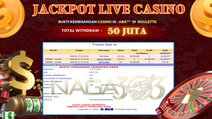 NAGA303 mengucapkan selamat kepada user id : ABA*** yang telah berhasil mendapatkan jackpot pada permainan LIVE CASINO DI ROULETTE. Kemenangan sebesar Rp 50.000.000,-. telah dibayarkan LUNAS oleh pihak naga303 kepada pemilik user id setelah yang bersangkutan mengisi formulir withdraw. Proses pencairan dana berlangsung sangat cepat hanya dalam waktu 6-11 menit sudah berada dalam rekening pemilik user id. Bukti transfer yang dapat anda lihat adalah bukti SAH / VALID yang langsung di dapatkan melalui bukti transaksi dari Bank yang digunakan untuk pengiriman dana pada rekening pemilik user id. Terima kasih kami sampaikan kepada para pengguna setia naga303 yang telah menggunakan situs kami, sebagai Bandar Terpercaya yang pastinya membayar semua kemenangan member hingga lunas. Apakah Naga303 PENIPU ? Reputasi “NAGA303 TERPERCAYA” sudah sangat melekat. puluhan hingga ratusan ribu pengguna setia NAGA303 tetap menggunakan situs terbesar dan terbaik di Indonesia ini. Hapus rasa was-was dan khawatir anda, kemenangan anda berapapun PASTI dibayarkan hingga lunas.