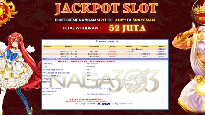 NAGA303 mengucapkan selamat kepada user id : ADI*** yang telah berhasil mendapatkan jackpot pada permainan SLOT DI SPACEMAN. Kemenangan sebesar Rp 52.000.000,-. telah dibayarkan LUNAS oleh pihak naga303 kepada pemilik user id setelah yang bersangkutan mengisi formulir withdraw. Proses pencairan dana berlangsung sangat cepat hanya dalam waktu 6-11 menit sudah berada dalam rekening pemilik user id. Bukti transfer yang dapat anda lihat adalah bukti SAH / VALID yang langsung di dapatkan melalui bukti transaksi dari Bank yang digunakan untuk pengiriman dana pada rekening pemilik user id. Terima kasih kami sampaikan kepada para pengguna setia naga303 yang telah menggunakan situs kami, sebagai Bandar Terpercaya yang pastinya membayar semua kemenangan member hingga lunas. Apakah Naga303 PENIPU ? Reputasi “NAGA303 TERPERCAYA” sudah sangat melekat. puluhan hingga ratusan ribu pengguna setia NAGA303 tetap menggunakan situs terbesar dan terbaik di Indonesia ini. Hapus rasa was-was dan khawatir anda, kemenangan anda berapapun PASTI dibayarkan hingga lunas.