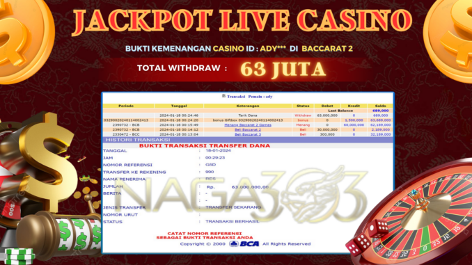 MEMBER NAGA303 MENERIMA PELUNASAN KEMENANGAN JACKPOT LIVE CASINO di BACCARAT 2 Rp 63.000.000,- LUNAS