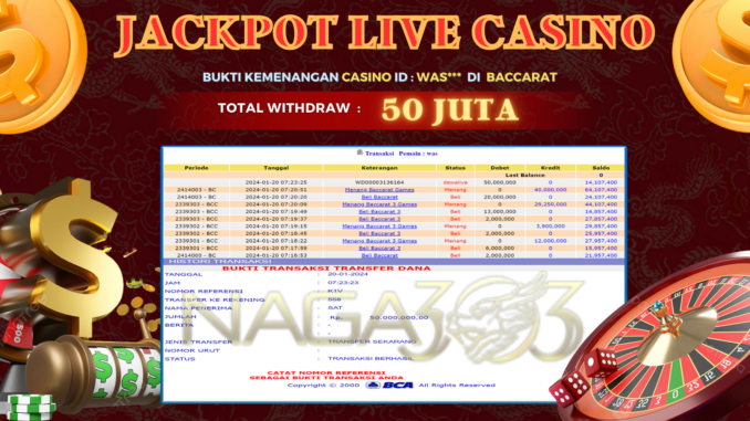 MEMBER NAGA303 MENERIMA PELUNASAN KEMENANGAN JACKPOT LIVE CASINO di BACCARAT 2 Rp 50.000.000,- LUNAS