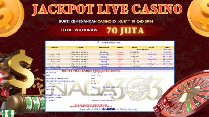 MEMBER NAGA303 MENERIMA PELUNASAN KEMENANGAN JACKPOT LIVE CASINO Rp 70.000.000,- LUNAS