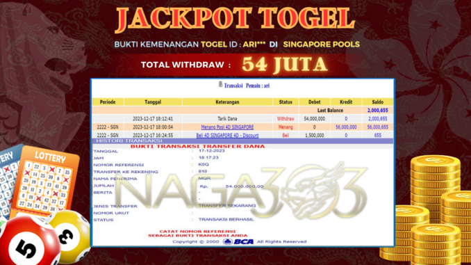MEMBER NAGA303 MENERIMA PELUNASAN KEMENANGAN JACKPOT TOGEL DI SINGAPORE POOLS Rp 54.000.000,- LUNAS