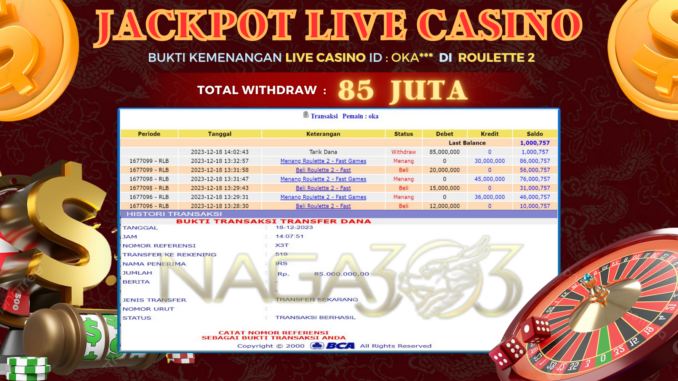 NAGA303 JACKPOT LIVE CASINO DI ROULETTE 2 Rp 85.000.000,- LUNAS