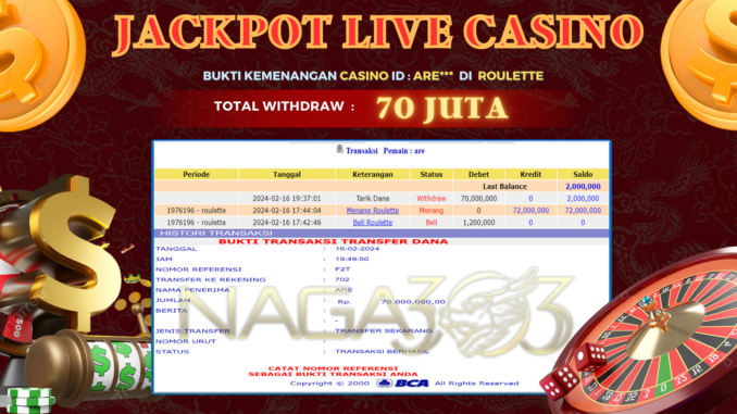 MEMBER NAGA303 MENERIMA PELUNASAN KEMENANGAN JACKPOT LIVE CASINO DI ROULETTE Rp 70.000.000,- LUNAS