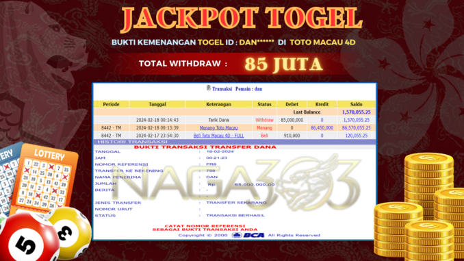 NAGA303 JACKPOT TOGEL DI TOTO MACAU 4D Rp 85.000.000,- LUNAS
