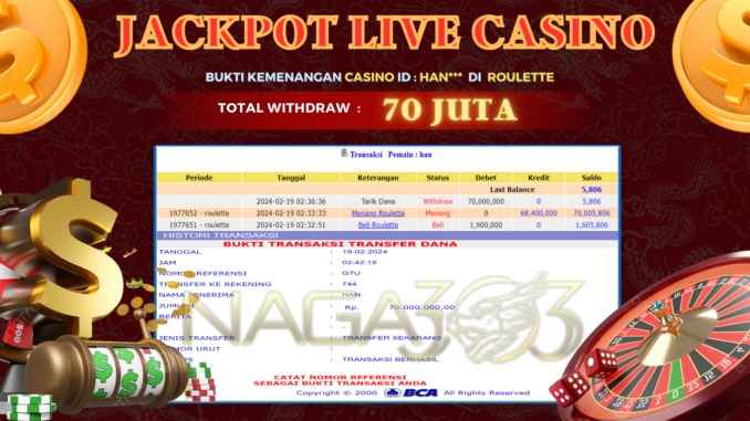 NAGA303 JACKPOT LIVE CASINO DI ROULETTE GAMES Rp 70.000.000,- LUNAS