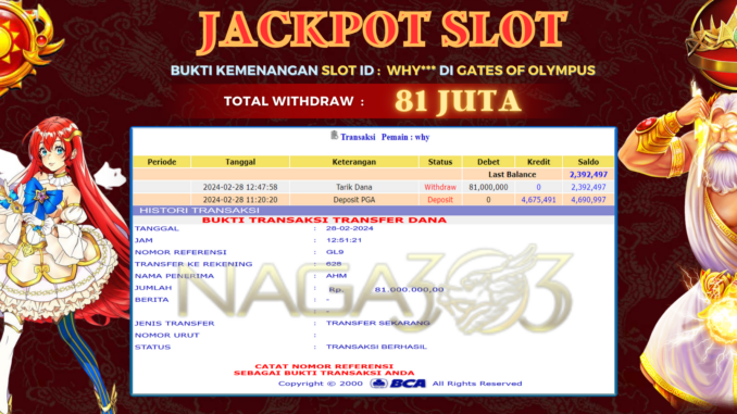 NAGA303 mengucapkan selamat kepada user id : WHY** yang telah berhasil mendapatkan jackpot pada permainan SLOT DI GATES OF OLYMPUS. Kemenangan sebesar Rp 81.000.000,-. telah dibayarkan LUNAS oleh pihak naga303 kepada pemilik user id setelah yang bersangkutan mengisi formulir withdraw. Proses pencairan dana berlangsung sangat cepat hanya dalam waktu 6-11 menit sudah berada dalam rekening pemilik user id. Bukti transfer yang dapat anda lihat adalah bukti SAH / VALID yang langsung di dapatkan melalui bukti transaksi dari Bank yang digunakan untuk pengiriman dana pada rekening pemilik user id. Terima kasih kami sampaikan kepada para pengguna setia naga303 yang telah menggunakan situs kami, sebagai Bandar Terpercaya yang pastinya membayar semua kemenangan member hingga lunas. Apakah Naga303 PENIPU ? Reputasi “NAGA303 TERPERCAYA” sudah sangat melekat. puluhan hingga ratusan ribu pengguna setia NAGA303 tetap menggunakan situs terbesar dan terbaik di Indonesia ini. Hapus rasa was-was dan khawatir anda, kemenangan anda berapapun PASTI dibayarkan hingga lunas.