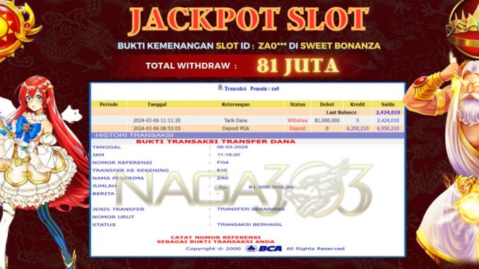 NAGA303 mengucapkan selamat kepada user id : ZAO** yang telah berhasil mendapatkan jackpot pada permainan SLOT DI SWEET BONANZA. Kemenangan sebesar Rp 81.000.000,-. telah dibayarkan LUNAS oleh pihak naga303 kepada pemilik user id setelah yang bersangkutan mengisi formulir withdraw. Proses pencairan dana berlangsung sangat cepat hanya dalam waktu 6-11 menit sudah berada dalam rekening pemilik user id. Bukti transfer yang dapat anda lihat adalah bukti SAH / VALID yang langsung di dapatkan melalui bukti transaksi dari Bank yang digunakan untuk pengiriman dana pada rekening pemilik user id. Terima kasih kami sampaikan kepada para pengguna setia naga303 yang telah menggunakan situs kami, sebagai Bandar Terpercaya yang pastinya membayar semua kemenangan member hingga lunas. Apakah Naga303 PENIPU ? Reputasi “NAGA303 TERPERCAYA” sudah sangat melekat. puluhan hingga ratusan ribu pengguna setia NAGA303 tetap menggunakan situs terbesar dan terbaik di Indonesia ini. Hapus rasa was-was dan khawatir anda, kemenangan anda berapapun PASTI dibayarkan hingga lunas.