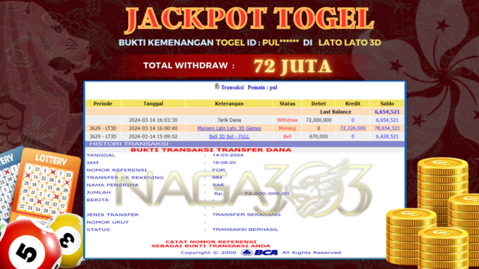 NAGA303 JACKPOT TOGEL DI LATO LATO 3D Rp 72.000.000,- LUNAS