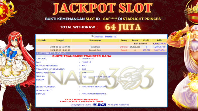 MEMBER NAGA303 MENERIMA PELUNASAN KEMENANGAN SLOT DI STARLIGHT PRINCES Rp 64.000.000,- LUNAS