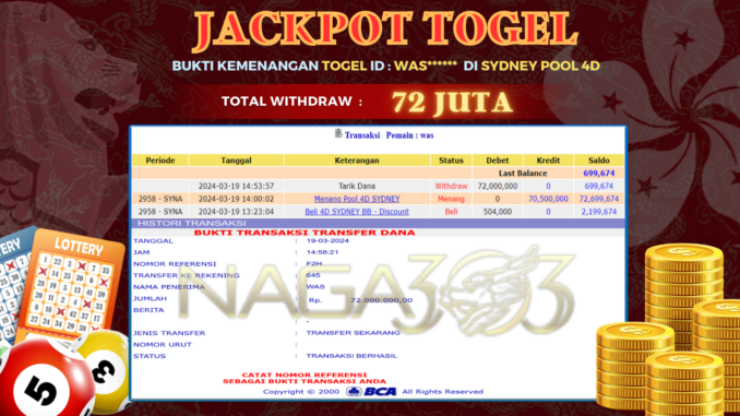 NAGA303 JACKPOT TOGEL DI SYDNEY POOLS Rp 72.000.000,- LUNAS