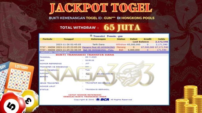 NAGA303 JACKPOT TOGEL DI HONGKONG POOLS Rp 65.000.000,- LUNAS