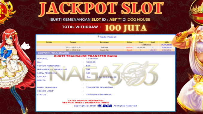 NAGA303 mengucapkan selamat kepada user id : ABI*** yang telah berhasil mendapatkan jackpot pada permainan SLOT DI DOG HOUSE. Kemenangan sebesar Rp 100.000.000,-. telah dibayarkan LUNAS oleh pihak naga303 kepada pemilik user id setelah yang bersangkutan mengisi formulir withdraw. Proses pencairan dana berlangsung sangat cepat hanya dalam waktu 6-11 menit sudah berada dalam rekening pemilik user id. Bukti transfer yang dapat anda lihat adalah bukti SAH / VALID yang langsung di dapatkan melalui bukti transaksi dari Bank yang digunakan untuk pengiriman dana pada rekening pemilik user id. Terima kasih kami sampaikan kepada para pengguna setia naga303 yang telah menggunakan situs kami, sebagai Bandar Terpercaya yang pastinya membayar semua kemenangan member hingga lunas. Apakah Naga303 PENIPU ? Reputasi “NAGA303 TERPERCAYA” sudah sangat melekat. puluhan hingga ratusan ribu pengguna setia NAGA303 tetap menggunakan situs terbesar dan terbaik di Indonesia ini. Hapus rasa was-was dan khawatir anda, kemenangan anda berapapun PASTI dibayarkan hingga lunas.