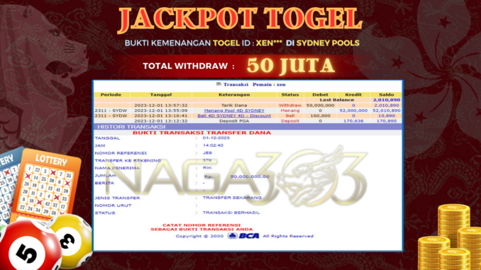 NAGA303 JACKPOT TOGEL DI SYDNEY POOLS Rp 50.000.000,- LUNAS