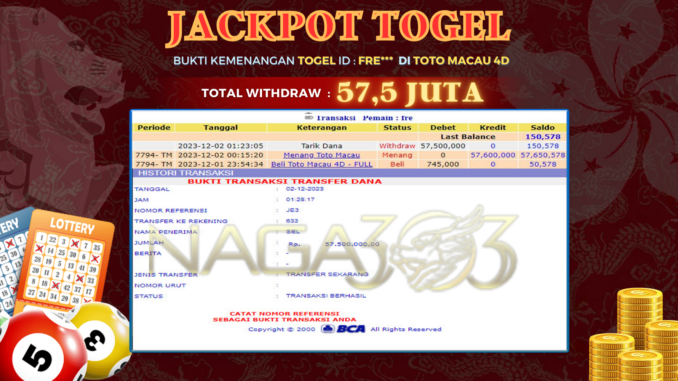 NAGA303 JACKPOT TOGEL DI TOTO MACAU 4D Rp 57.500.000,- LUNAS