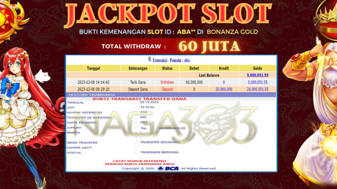 MEMBER NAGA303 MENERIMA PELUNASAN KEMENANGAN JACKPOT SLOT DI BONANZA GOLD Rp 60.000.000,- LUNAS
