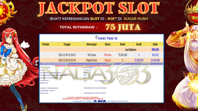 NAGA303 mengucapkan selamat kepada user id : KOI** yang telah berhasil mendapatkan jackpot pada permainan JACKPOT SLOT DI SUGAR RUSH . Kemenangan sebesar Rp 75.000.000,-. telah dibayarkan LUNAS oleh pihak naga303 kepada pemilik user id setelah yang bersangkutan mengisi formulir withdraw. Proses pencairan dana berlangsung sangat cepat hanya dalam waktu 6-11 menit sudah berada dalam rekening pemilik user id. Bukti transfer yang dapat anda lihat adalah bukti SAH / VALID yang langsung di dapatkan melalui bukti transaksi dari Bank yang digunakan untuk pengiriman dana pada rekening pemilik user id. Terima kasih kami sampaikan kepada para pengguna setia naga303 yang telah menggunakan situs kami, sebagai Bandar Terpercaya yang pastinya membayar semua kemenangan member hingga lunas. Apakah Naga303 PENIPU ? Reputasi “NAGA303 TERPERCAYA” sudah sangat melekat. puluhan hingga ratusan ribu pengguna setia NAGA303 tetap menggunakan situs terbesar dan terbaik di Indonesia ini. Hapus rasa was-was dan khawatir anda, kemenangan anda berapapun PASTI dibayarkan hingga lunas.