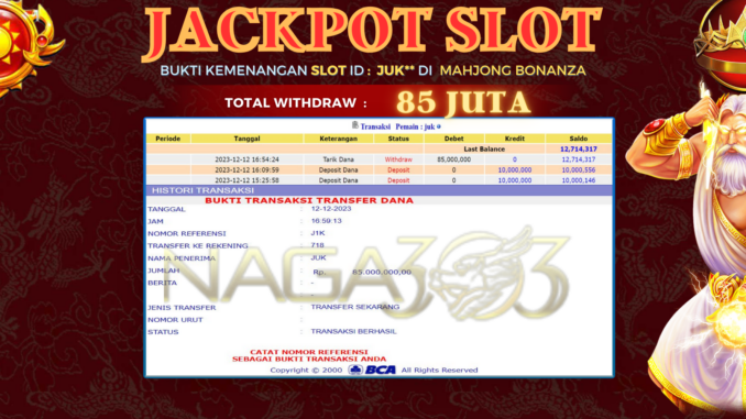 NAGA303 mengucapkan selamat kepada user id : JUK** yang telah berhasil mendapatkan jackpot pada permainan SLOT di MAHJONG BONANZA . Kemenangan sebesar Rp 85.000.000,-. telah dibayarkan LUNAS oleh pihak naga303 kepada pemilik user id setelah yang bersangkutan mengisi formulir withdraw. Proses pencairan dana berlangsung sangat cepat hanya dalam waktu 6-11 menit sudah berada dalam rekening pemilik user id. Bukti transfer yang dapat anda lihat adalah bukti SAH / VALID yang langsung di dapatkan melalui bukti transaksi dari Bank yang digunakan untuk pengiriman dana pada rekening pemilik user id. Terima kasih kami sampaikan kepada para pengguna setia naga303 yang telah menggunakan situs kami, sebagai Bandar Terpercaya yang pastinya membayar semua kemenangan member hingga lunas. Apakah Naga303 PENIPU ? Reputasi “NAGA303 TERPERCAYA” sudah sangat melekat. puluhan hingga ratusan ribu pengguna setia NAGA303 tetap menggunakan situs terbesar dan terbaik di Indonesia ini. Hapus rasa was-was dan khawatir anda, kemenangan anda berapapun PASTI dibayarkan hingga lunas.