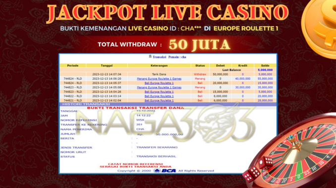 NAGA303 mengucapkan selamat kepada user id : CHA** yang telah berhasil mendapatkan jackpot pada permainan LIVE CASINO DI ROULETTE 1 . Kemenangan sebesar Rp 50.000.000,-. telah dibayarkan LUNAS oleh pihak naga303 kepada pemilik user id setelah yang bersangkutan mengisi formulir withdraw. Proses pencairan dana berlangsung sangat cepat hanya dalam waktu 6-11 menit sudah berada dalam rekening pemilik user id. Bukti transfer yang dapat anda lihat adalah bukti SAH / VALID yang langsung di dapatkan melalui bukti transaksi dari Bank yang digunakan untuk pengiriman dana pada rekening pemilik user id. Terima kasih kami sampaikan kepada para pengguna setia naga303 yang telah menggunakan situs kami, sebagai Bandar Terpercaya yang pastinya membayar semua kemenangan member hingga lunas. Apakah Naga303 PENIPU ? Reputasi “NAGA303 TERPERCAYA” sudah sangat melekat. puluhan hingga ratusan ribu pengguna setia NAGA303 tetap menggunakan situs terbesar dan terbaik di Indonesia ini. Hapus rasa was-was dan khawatir anda, kemenangan anda berapapun PASTI dibayarkan hingga lunas.