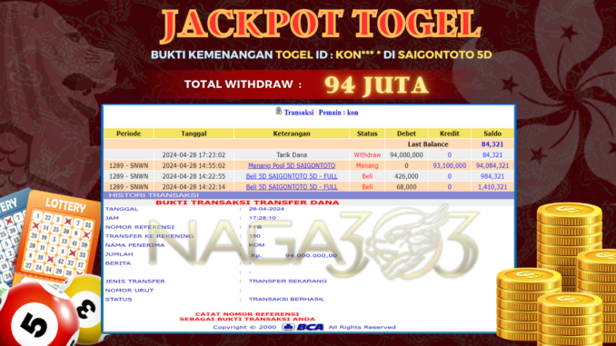 MEMBER NAGA303 MENERIMA PELUNASAN KEMENANGAN JACKPOT TOGEL DI SAIGONTOTO 5D Rp 94.000.000,- LUNAS