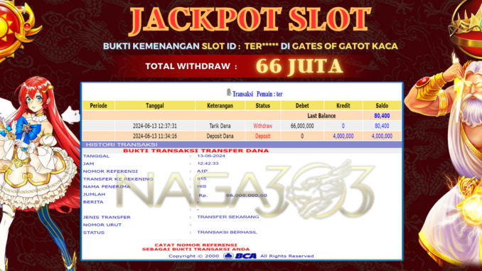 NAGA303 mengucapkan selamat kepada user id : TER*** yang telah berhasil mendapatkan jackpot pada permainan SLOT di GATES OF GATOT KACA . Kemenangan sebesar Rp 66.000.000,-. telah dibayarkan LUNAS oleh pihak naga303 kepada pemilik user id setelah yang bersangkutan mengisi formulir withdraw. Proses pencairan dana berlangsung sangat cepat hanya dalam waktu 6-11 menit sudah berada dalam rekening pemilik user id. Bukti transfer yang dapat anda lihat adalah bukti SAH / VALID yang langsung di dapatkan melalui bukti transaksi dari Bank yang digunakan untuk pengiriman dana pada rekening pemilik user id. Terima kasih kami sampaikan kepada para pengguna setia naga303 yang telah menggunakan situs kami, sebagai Bandar Terpercaya yang pastinya membayar semua kemenangan member hingga lunas. Apakah Naga303 PENIPU ? Reputasi “NAGA303 TERPERCAYA” sudah sangat melekat. puluhan hingga ratusan ribu pengguna setia NAGA303 tetap menggunakan situs terbesar dan terbaik di Indonesia ini. Hapus rasa was-was dan khawatir anda, kemenangan anda berapapun PASTI dibayarkan hingga lunas.