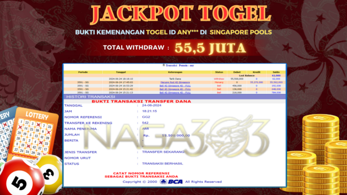 NAGA303 JACKPOT TOGEL di SINGAPORE POOLSRp 55.500.000,- LUNAS