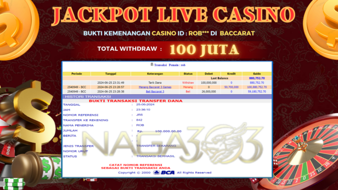 NAGA303 JACKPOT LIVE CASINO di BACCARAT Rp 100.000.000,- LUNAS