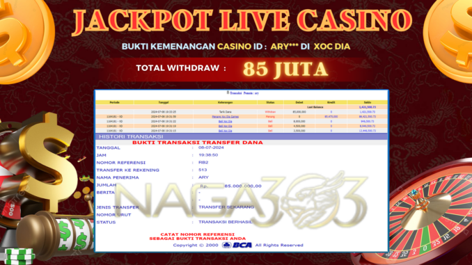MEMBER NAGA303 MENERIMA PELUNASAN KEMENANGAN JACKPOT LIVE CASINO DI XOC DIA Rp 85.000.000,- LUNAS
