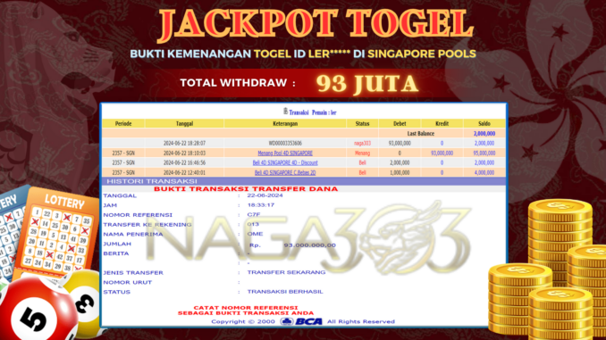 MEMBER NAGA303 MENERIMA PELUNASAN KEMENANGAN JACKPOT TOGEL di SINGAPORE POOLS Rp 93.000.000,- LUNAS