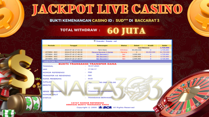 MEMBER NAGA303 MENERIMA PELUNASAN KEMENANGAN JACKPOT LIVE CASINO DI BACCARAT 3 Rp 60.000.000,- LUNAS