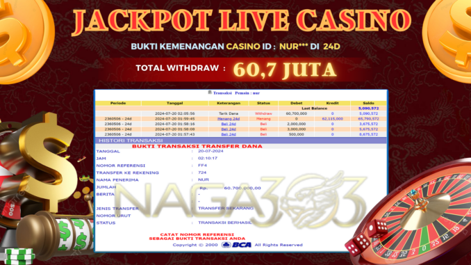 MEMBER NAGA303 MENERIMA PELUNASAN KEMENANGAN JACKPOT LIVE CASINO DI 24D Rp 60.700.000,- LUNAS