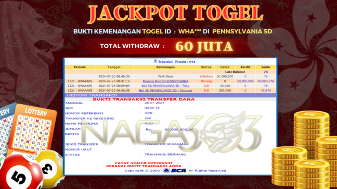 NAGA303 JACKPOT TOGEL DI PENNSYLVANIA 5D Rp 60.000.000,- LUNAS