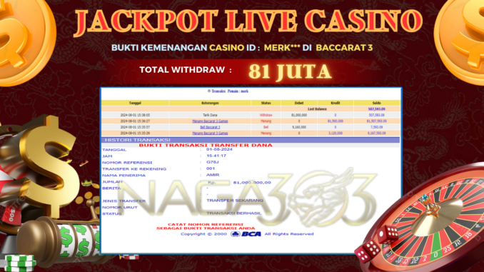 NAGA303 JACKPOT LIVE CASINO DI BACCARAT 3 Rp 81.000.000,- LUNAS