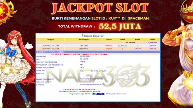 NAGA303 mengucapkan selamat kepada user id : KUY*** yang telah berhasil mendapatkan jackpot pada permainan SLOT DI SPACEMAN. Kemenangan sebesar Rp 52.500.000,-. telah dibayarkan LUNAS oleh pihak naga303 kepada pemilik user id setelah yang bersangkutan mengisi formulir withdraw. Proses pencairan dana berlangsung sangat cepat hanya dalam waktu 6-11 menit sudah berada dalam rekening pemilik user id. Bukti transfer yang dapat anda lihat adalah bukti SAH / VALID yang langsung di dapatkan melalui bukti transaksi dari Bank yang digunakan untuk pengiriman dana pada rekening pemilik user id. Terima kasih kami sampaikan kepada para pengguna setia naga303 yang telah menggunakan situs kami, sebagai Bandar Terpercaya yang pastinya membayar semua kemenangan member hingga lunas. Apakah Naga303 PENIPU ? Reputasi “NAGA303 TERPERCAYA” sudah sangat melekat. puluhan hingga ratusan ribu pengguna setia NAGA303 tetap menggunakan situs terbesar dan terbaik di Indonesia ini. Hapus rasa was-was dan khawatir anda, kemenangan anda berapapun PASTI dibayarkan hingga lunas.