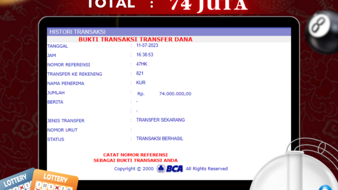 NAGA303 mengucapkan selamat kepada user id : KUN*** yang telah berhasil mendapatkan jackpot pada permainan TOGEL DI TOTOMACAU 5D. Kemenangan sebesar Rp 74.000.000,-. telah dibayarkan LUNAS oleh pihak naga303 kepada pemilik user id setelah yang bersangkutan mengisi formulir withdraw. Proses pencairan dana berlangsung sangat cepat hanya dalam waktu 6-11 menit sudah berada dalam rekening pemilik user id. Bukti transfer yang dapat anda lihat adalah bukti SAH / VALID yang langsung di dapatkan melalui bukti transaksi dari Bank yang digunakan untuk pengiriman dana pada rekening pemilik user id. Terima kasih kami sampaikan kepada para pengguna setia naga303 yang telah menggunakan situs kami, sebagai Bandar Terpercaya yang pastinya membayar semua kemenangan member hingga lunas. Apakah Naga303 PENIPU ? Reputasi “NAGA303 TERPERCAYA” sudah sangat melekat. puluhan hingga ratusan ribu pengguna setia NAGA303 tetap menggunakan situs terbesar dan terbaik di Indonesia ini. Hapus rasa was-was dan khawatir anda, kemenangan anda berapapun PASTI dibayarkan hingga lunas.