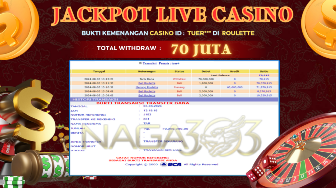 MEMBER NAGA303 MENERIMA PELUNASAN KEMENANGAN JACKPOT LIVE CASINO DI ROULETTE Rp 70.000.000,- LUNAS