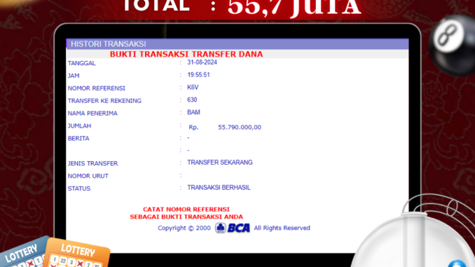 NAGA303 mengucapkan selamat kepada user id : COI** yang telah berhasil mendapatkan jackpot pada permainan TOGEL DI 3D SPAIN. Kemenangan sebesar Rp 55.700.000,-. telah dibayarkan LUNAS oleh pihak naga303 kepada pemilik user id setelah yang bersangkutan mengisi formulir withdraw. Proses pencairan dana berlangsung sangat cepat hanya dalam waktu 6-11 menit sudah berada dalam rekening pemilik user id. Bukti transfer yang dapat anda lihat adalah bukti SAH / VALID yang langsung di dapatkan melalui bukti transaksi dari Bank yang digunakan untuk pengiriman dana pada rekening pemilik user id. Terima kasih kami sampaikan kepada para pengguna setia naga303 yang telah menggunakan situs kami, sebagai Bandar Terpercaya yang pastinya membayar semua kemenangan member hingga lunas. Apakah Naga303 PENIPU ? Reputasi “NAGA303 TERPERCAYA” sudah sangat melekat. puluhan hingga ratusan ribu pengguna setia NAGA303 tetap menggunakan situs terbesar dan terbaik di Indonesia ini. Hapus rasa was-was dan khawatir anda, kemenangan anda berapapun PASTI dibayarkan hingga lunas.