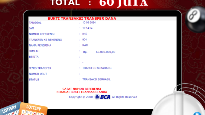 NAGA303 mengucapkan selamat kepada user id : IUY*** yang telah berhasil mendapatkan jackpot pada permainan TOGEL DI TAIWAN 4D . Kemenangan sebesar Rp 60.000.000,-. telah dibayarkan LUNAS oleh pihak naga303 kepada pemilik user id setelah yang bersangkutan mengisi formulir withdraw. Proses pencairan dana berlangsung sangat cepat hanya dalam waktu 6-11 menit sudah berada dalam rekening pemilik user id. Bukti transfer yang dapat anda lihat adalah bukti SAH / VALID yang langsung di dapatkan melalui bukti transaksi dari Bank yang digunakan untuk pengiriman dana pada rekening pemilik user id. Terima kasih kami sampaikan kepada para pengguna setia naga303 yang telah menggunakan situs kami, sebagai Bandar Terpercaya yang pastinya membayar semua kemenangan member hingga lunas. Apakah Naga303 PENIPU ? Reputasi “NAGA303 TERPERCAYA” sudah sangat melekat. puluhan hingga ratusan ribu pengguna setia NAGA303 tetap menggunakan situs terbesar dan terbaik di Indonesia ini. Hapus rasa was-was dan khawatir anda, kemenangan anda berapapun PASTI dibayarkan hingga lunas.