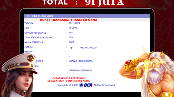NAGA303 mengucapkan selamat kepada user id : SMA*** yang telah berhasil mendapatkan jackpot pada permainan SLOT DI GATES OF OLYMPUS 1000. Kemenangan sebesar Rp 91.000.000,-. telah dibayarkan LUNAS oleh pihak naga303 kepada pemilik user id setelah yang bersangkutan mengisi formulir withdraw. Proses pencairan dana berlangsung sangat cepat hanya dalam waktu 6-11 menit sudah berada dalam rekening pemilik user id. Bukti transfer yang dapat anda lihat adalah bukti SAH / VALID yang langsung di dapatkan melalui bukti transaksi dari Bank yang digunakan untuk pengiriman dana pada rekening pemilik user id. Terima kasih kami sampaikan kepada para pengguna setia naga303 yang telah menggunakan situs kami, sebagai Bandar Terpercaya yang pastinya membayar semua kemenangan member hingga lunas. Apakah Naga303 PENIPU ? Reputasi “NAGA303 TERPERCAYA” sudah sangat melekat. puluhan hingga ratusan ribu pengguna setia NAGA303 tetap menggunakan situs terbesar dan terbaik di Indonesia ini. Hapus rasa was-was dan khawatir anda, kemenangan anda berapapun PASTI dibayarkan hingga lunas.